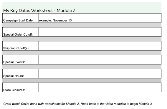 …how much time you need? That’s really up to you. The campaign is adaptable so you can choose to use as much or as little as you want. In general, it’s a good idea to plan for about 1-2 hours of marketing time a week while you are creating your campaign elements, whether you’re pre-building them ahead of the season, or creating them as you go this winter.
